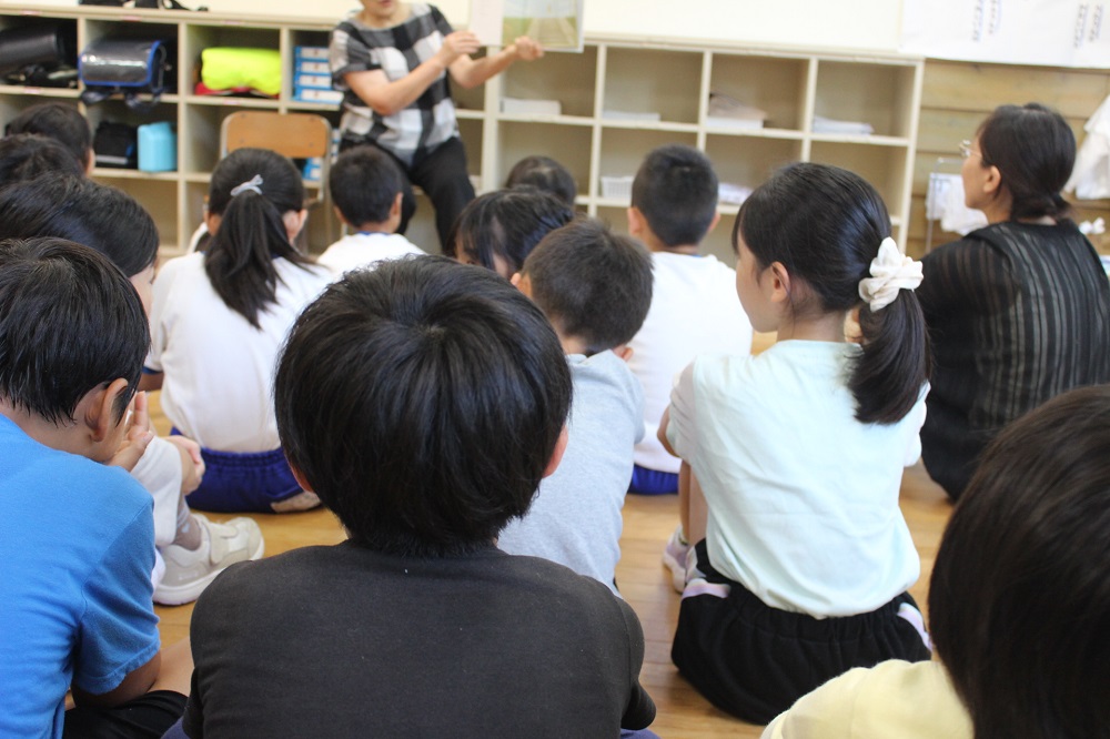 昨日9日(火)朝、「読み聞かせ」がありました。月に一度、地域の方、小木図書館の職員の方においでいただき、1~3年生、4~6年生に分かれて行っています。昨日は、敬老の日が近いためか、おじいちゃん、おばあちゃんを題材にした本を読んでいただきました。