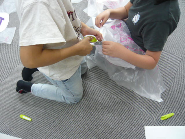 4年生は、小道具を一生懸命作っていました。互いに協力して、ゴミ袋を切って…(何に使うかは当日のお楽しみ)。発表が今から楽しみです。