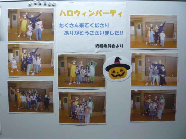 放課後、職員室前の掲示板に、先週21日(火)に行われた「ハロウィンイベント」(総務委企画)で仮装した先生方と子どもたちが一緒に撮影した写真が掲示されていました。そして、たくさん来てくださりありがとうございました(総務委員会より)といった文も貼られていました。