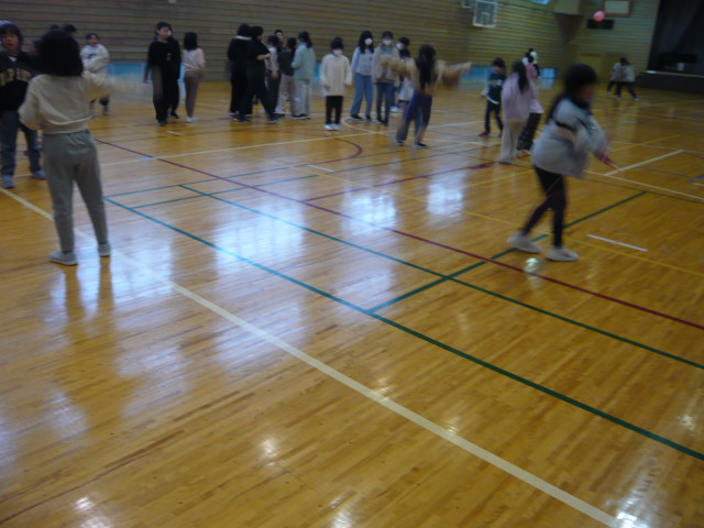 15分休みや昼休みになると、体育館で短なわ、長なわの練習をしている子どもたちが大勢います。長なわは、各学年で目標回数を決め、その回数を目指して練習しています。体育館には、「はいっ!」「はいっ!」「はいっ!」といった掛け声が響いています。