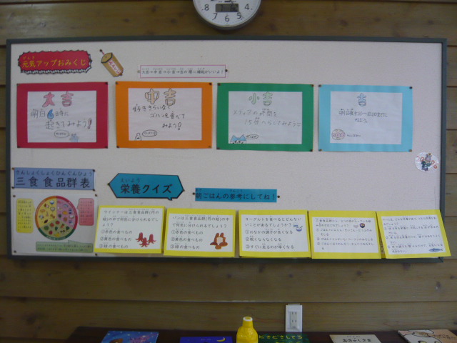 養護教諭が、毎月、保健にかかわる掲示物を作成し、児童玄関の掲示板に掲示しています。今月は「元気アップおみくじ」と「栄養クイズ」です。子どもたちは、掲示板の前を通るたびにおみくじをひいて、今日の運勢? を確認しています。また、栄養クイズは、「三食食品群表」をヒントに応えられるようになっています。