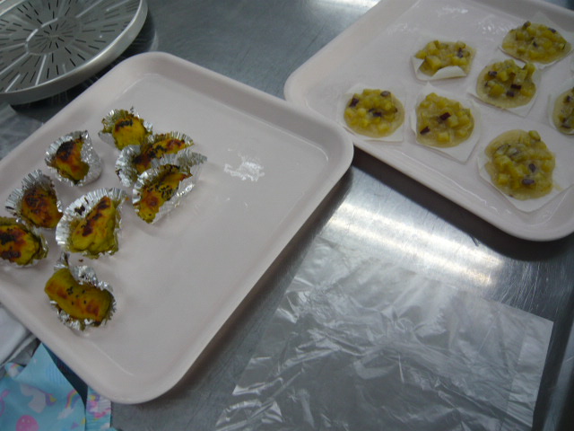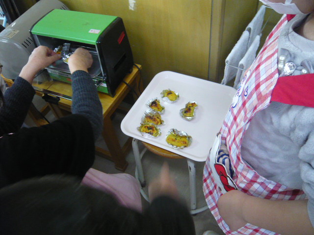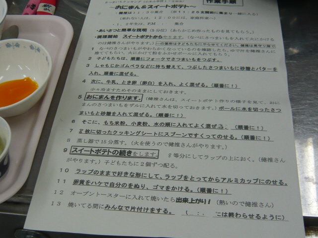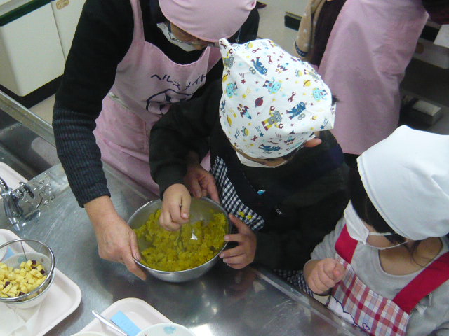 1・2年生が収穫したサツマイモをつかって、健康推進委員の皆様に教えてもらいながらスイートポテトとおにまんを作りました。自分たちで調理したスイートポテトとおにまん(おにまんじゅう)の味は格別でした!