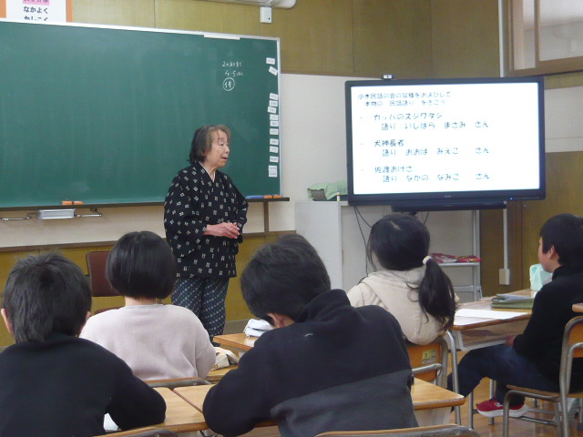 本日、「小木民話の会」の皆様においでいただき、本物の「民話語り」をききました。小木地区に伝わる3つの民話「カッパのスジワタシ」「犬神長者」「佐渡おけさ」です。子どもたちは、その語りにどっぷり浸り、民話に引き込まれていきました。民話の中には、佐渡弁や今はつかわれていない言葉などがありましたが、話の内容から言葉の意味や様子を想像しながらきいていたようです。