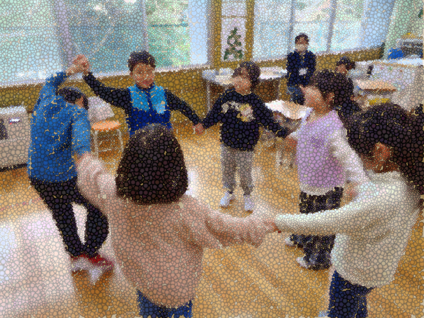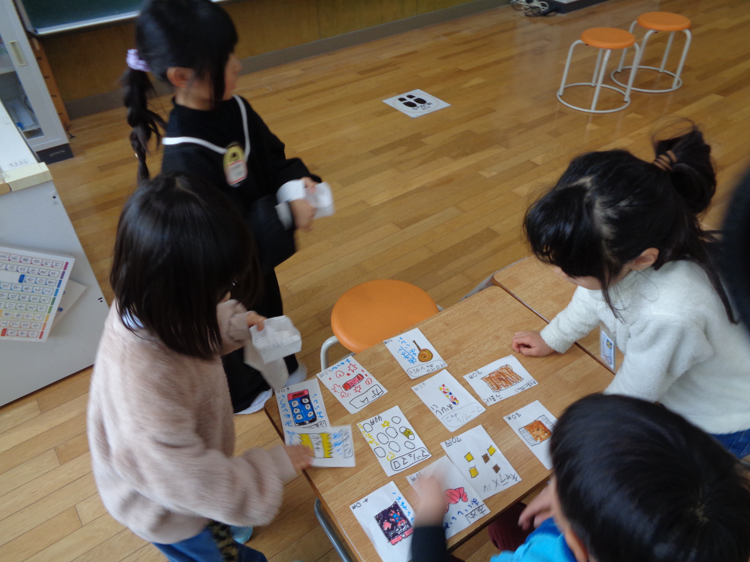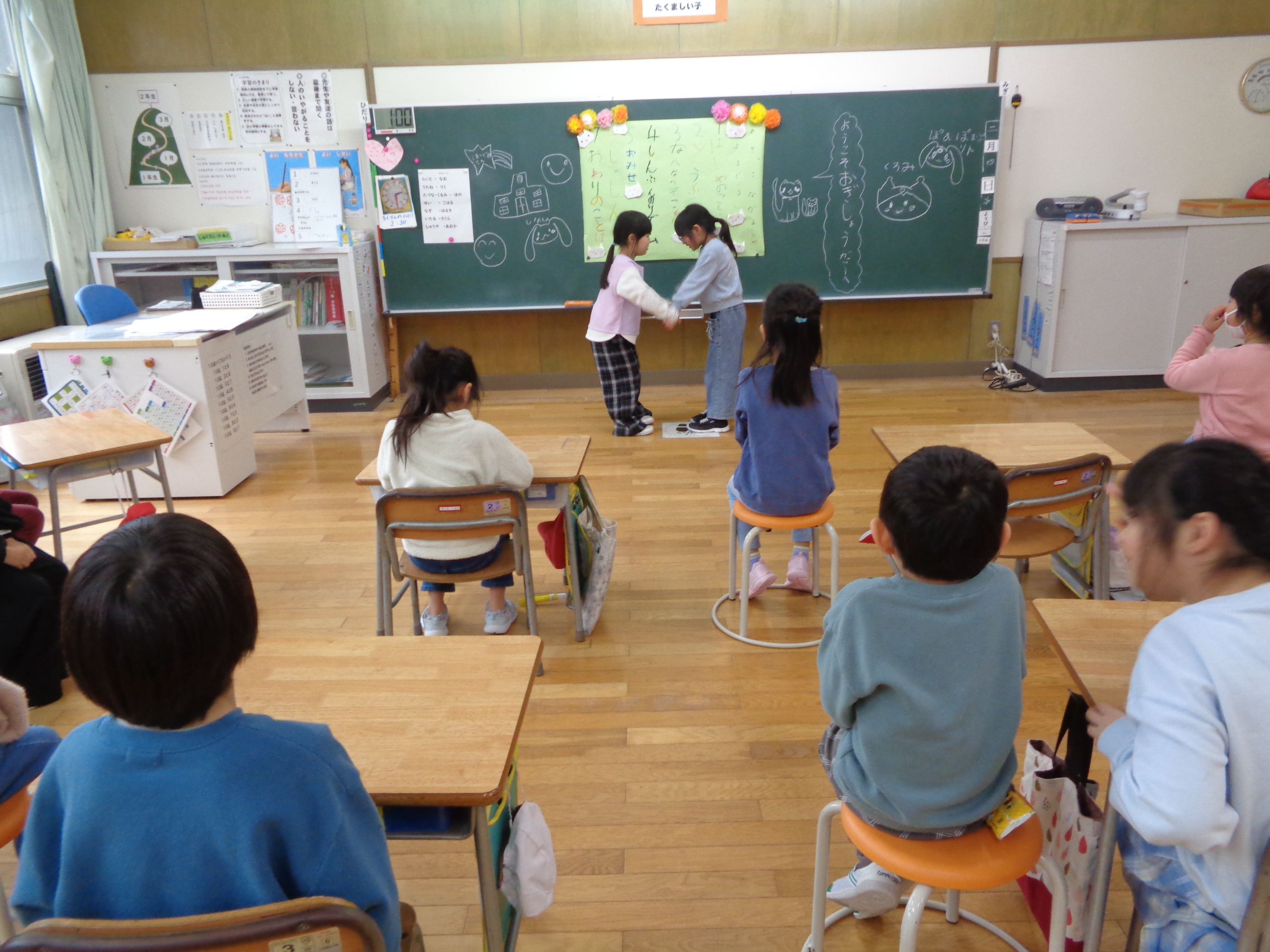 本日、令和8年度入学児童保護者説明会、小木幼稚園年長さんと1年生の交流会がありました。1年生は、この日に向け準備を進めていました。ランチルームに年長さんをお迎えに行ったときの表情は、もう立派なお姉さん、お兄さんでした。ペアの年長さんにやさしく声をかけ、手をつないで1年生教室まで連れていきました。「どうぶつクイズ」「なべなべそこぬけ」「しんぶんのり」「おみせ」など、自分たちで進行や遊びの説明をしました。そして、最後はみんなで「ハイ、チーズ!」