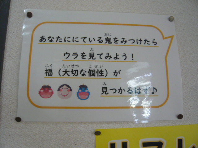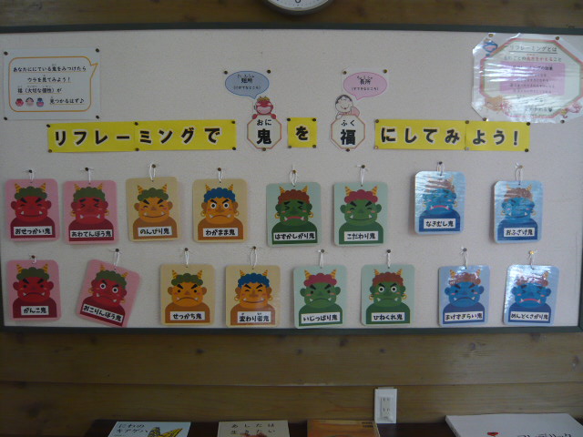 2月の掲示は、「リフレーミングで鬼を福にしてみよう」です。リフレーミングとは、ものごとの見方を変えることです。「あわてんぼう鬼」「のんびり鬼」など、たくさんの鬼がいますが、見方を変える(ひっくり返す)と福になりますよ、という掲示です。