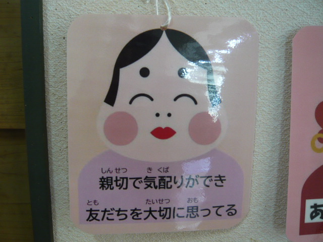 朝、1年生が掲示をじっと見て、「ぼくは、『おこりんぼう鬼』だと言いました。そこで、「私は何鬼?」と尋ねると、「先生は『おせっかい鬼』」と言われました。内心、子どもはよく見ている…、 と驚きました(笑)