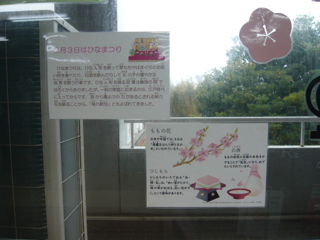上の写真は図書室の掲示です。まもなく3月、ひな祭りの季節ですね。掲示の前には、ひな祭りに関連する絵本(佐和みすえ『パオズになったおひなさま』、ますだゆうこ『ひなまつりルンルンおんなのこの日!』、瀬尾七重『ひなまつりに おひなさまを かざるわけ』)が置いてあります。もちろん絶賛貸し出し中!
