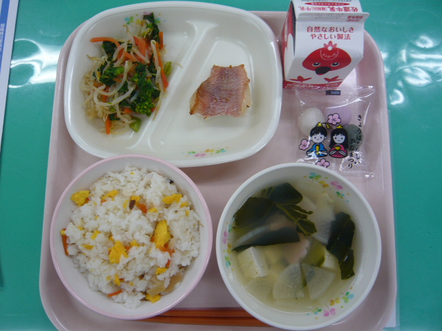写真左から給食(ちらし寿司、赤魚の塩こうじ焼き、菜の花のおひたし、あさりのうしお汁、になまつり三色大福、牛乳)、